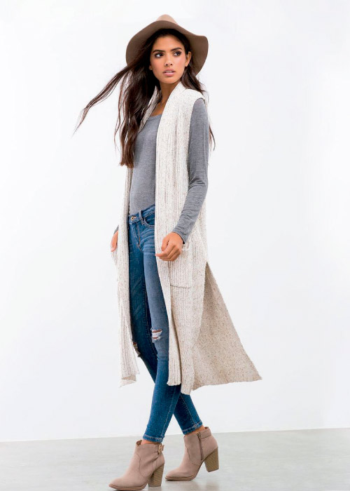Hablando de funcionalidad, el chaleco largo se ha convertido en una prenda que complementa muy bien tu look. Es una pieza que se acomoda al clima y te ayuda cuando sales de fiesta y buscas algo abrigador pero no quieres complicarte la noche con algo muy pesado.